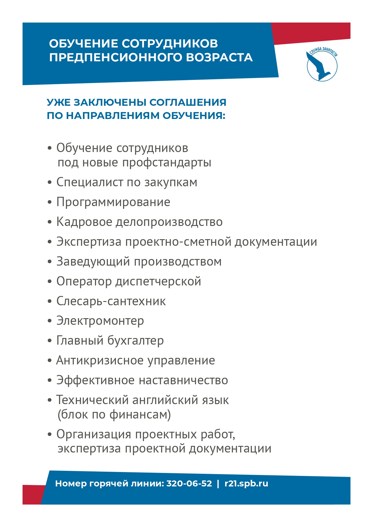В рамках реализации регионального проекта «Разработка и реализация программы системной поддержки и повышения качества жизни граждан старшего поколения» и Плана мероприятий по реализации регионального проекта «Разработка и реализация программы системной поддержки и повышения качества жизни граждан старшего поколения» СПб ГАУ ЦЗН проводит обучение работников предпенсионного возраста, в целях развития их профессиональных навыков и компетенций.