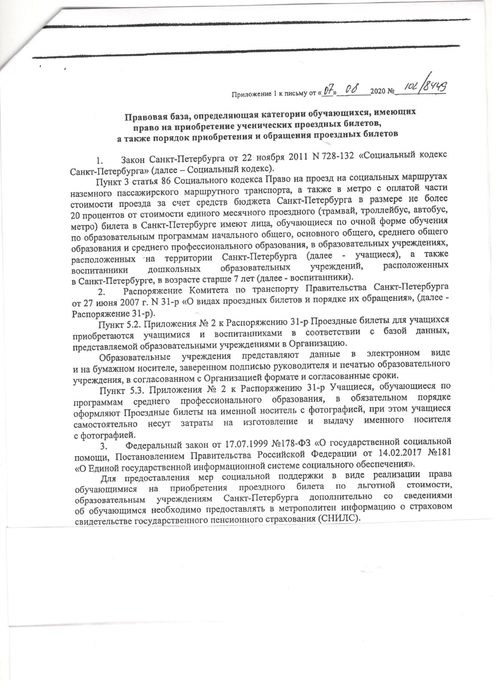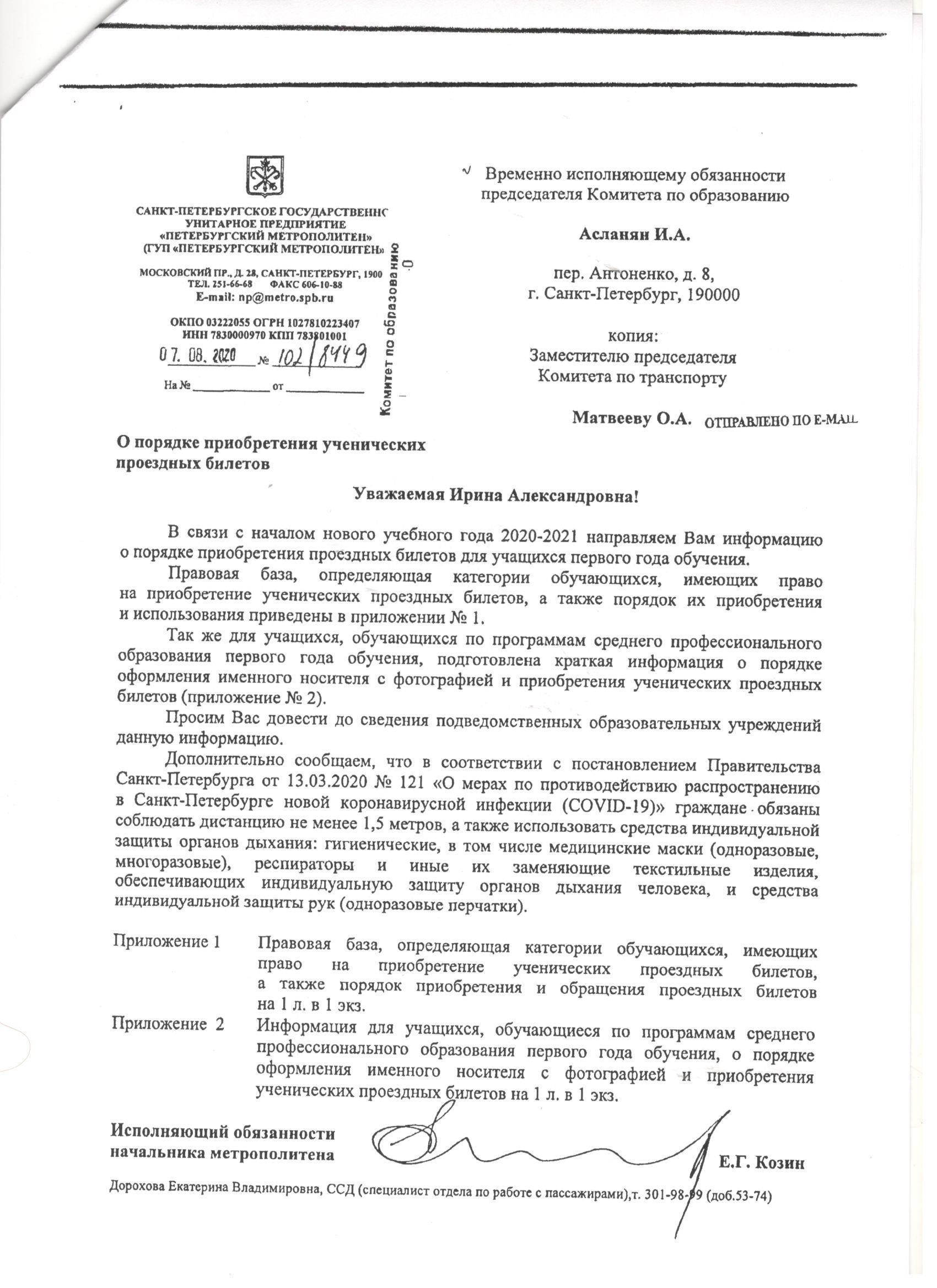 Также письмо ГУП "Петербургский метрополитен" от 07.08.2020 № 102/8449 "О порядке приобретения ученических проездных билетов".